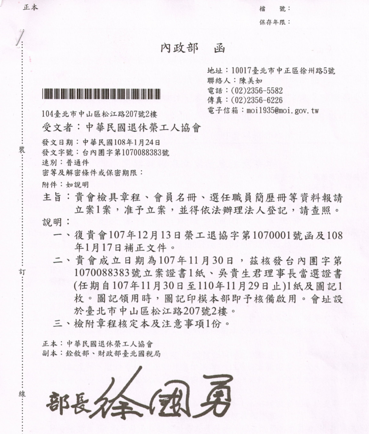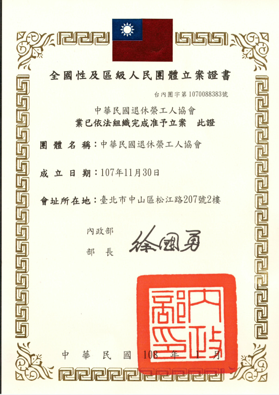 最新公告中華民國榮工退休人協會內政部核准函暨立案證書