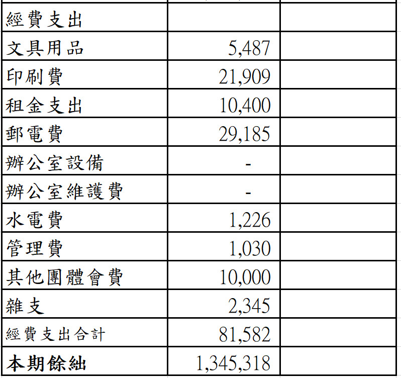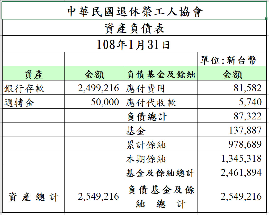 公告本會108年1月資產負債及收支決算表