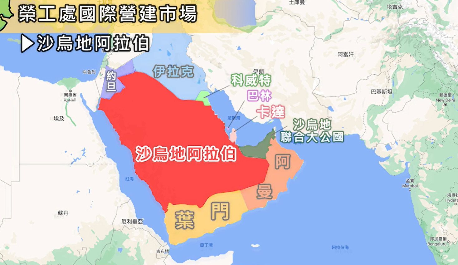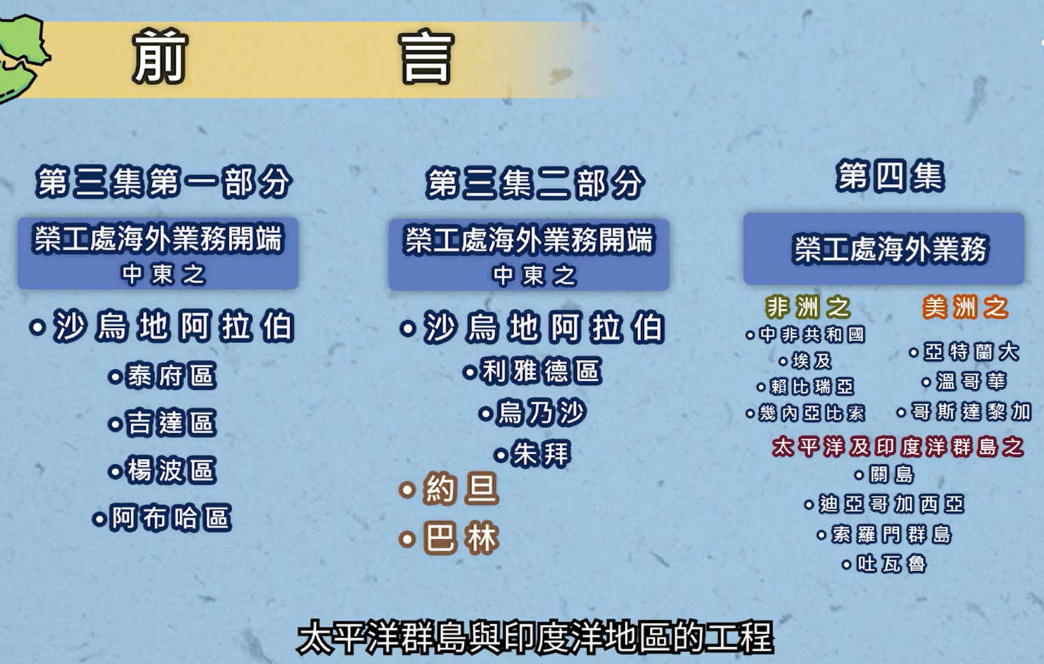 榮工處於1966年進軍全球國際營建市場,海外工程遍佈東南亞、非洲、中東、美洲、太平洋群島及印度洋等地區,之前的影片第一、二集已介紹東南亞市場6個國家的工程,本集為第三集,將接續介紹中東地區沙烏地阿拉伯的泰府、吉達、楊波、布哈、利雅德、烏乃沙、朱拜等區,以及約旦與巴林。考量影片長度,將第三集分為兩部分,第一部分(3/4之一)先介紹沙烏地阿拉伯西岸濱臨紅海的泰府、吉達、楊波、阿布哈等區,第二部分(3/4之二)介紹沙烏地阿拉伯利雅德、烏乃沙與朱拜等區,以及約旦與巴林。第四集將接續介紹非洲、美洲、太平洋群島與印度洋地區的工程。