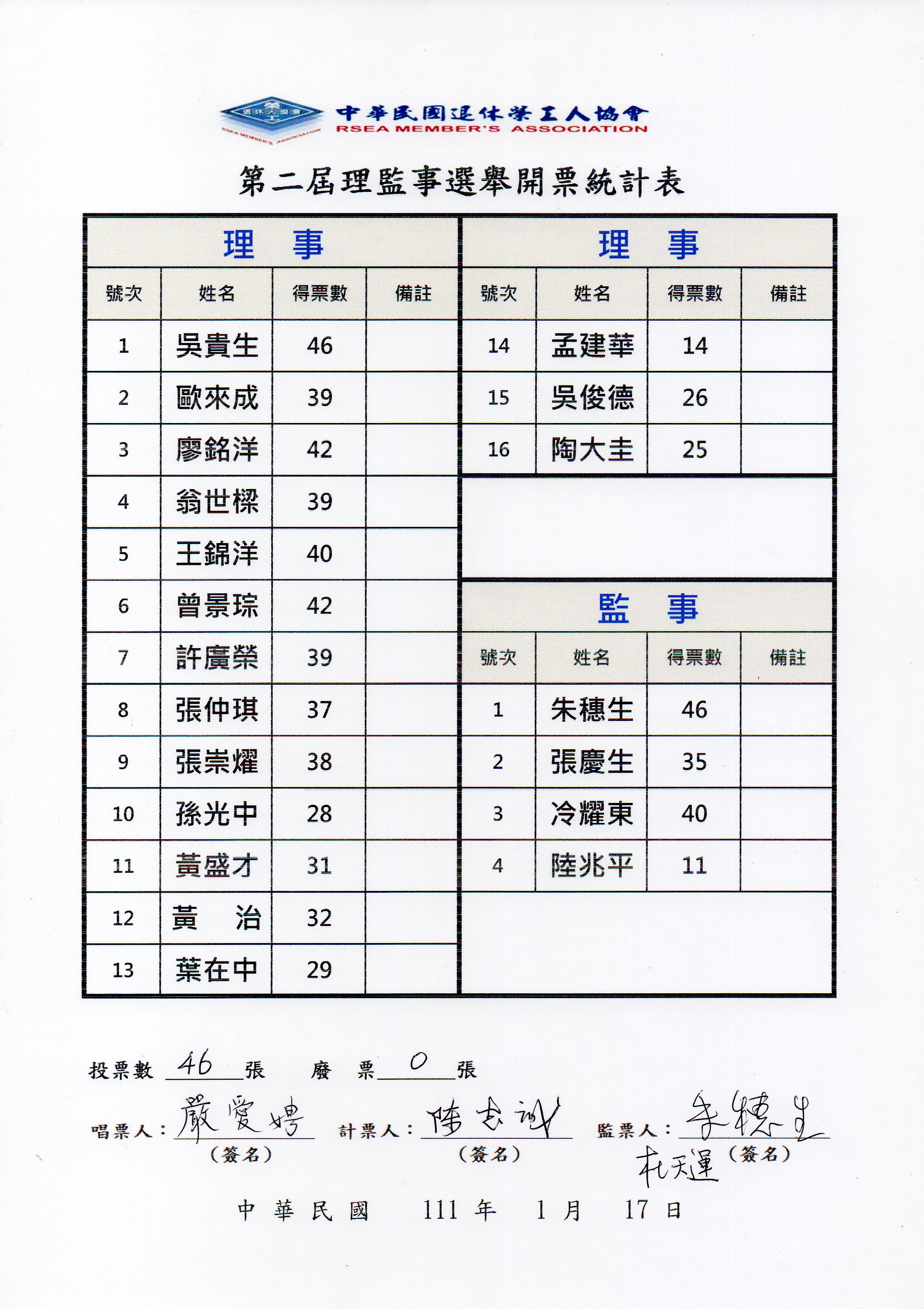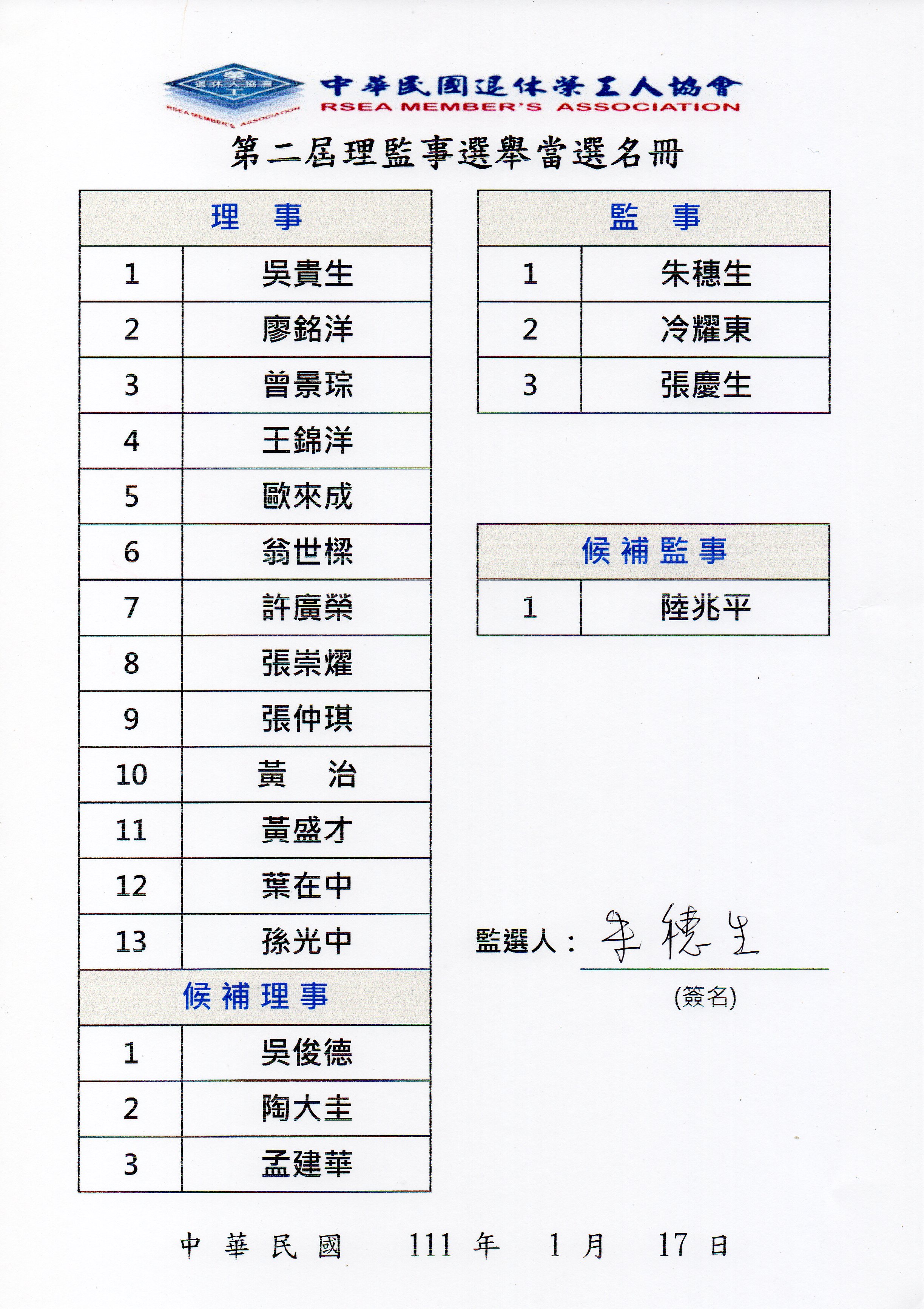 本協會依110/12/12第一屆第二次司選會議、第十三次理監事聯席會議暨本會北部地區會員及退休同仁會餐於台北市南京東路2段69號北平逸仙樓餐廳舉行。經司選會議審議通過吳貴生、歐來成、廖銘洋、翁世樑、張崇燿、許廣榮、曾景琮、王錦洋、孫光中、黃盛才、張仲琪、黃治、葉在中、孟建華、吳俊德、陶大圭等參選理事,朱穗生、張慶生、冷耀東、陸兆平參選監事。並經理監事聯席會決議於111年1月17日召開第二屆第一次會員代表大會租用東吳大學城中校區會議室舉行,會中並辦理第二屆理監事選舉,經出席會員代表及授權被委託人投票結果,當選名單如下表所示: