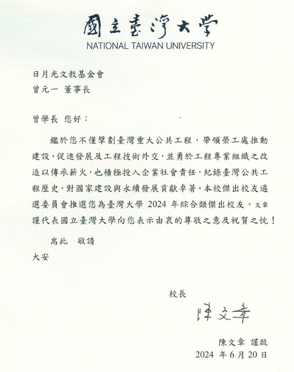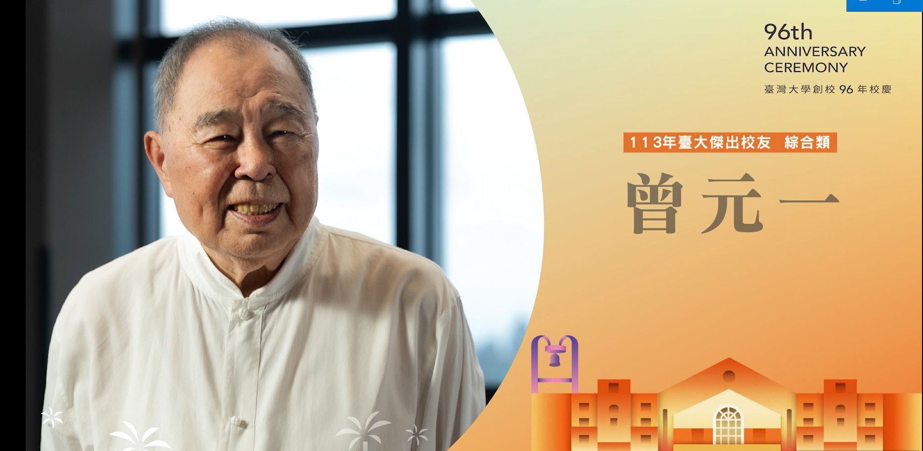 2024/11/15為臺大創校96週年校慶,上午九時於臺大綜合體育館三樓舉辦傑出校友表揚典禮,由陳文章校長主持為十位獲選的傑出校友頒獎,曾元ㄧ董事長此次榮膺傑出校友獎,榮民工程公司與日月光文教基金會同仁們皆感與有榮焉,曾元ㄧ董事長帶夫人淑梅及女兒雅君出席頒獎典禮,相關頒獎活動照片和大家分享。